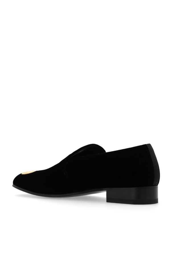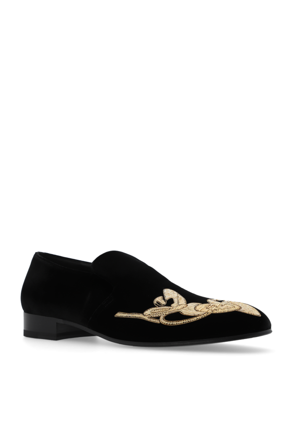Black loafers from Alexander McQueen. Made of velvet, this pair features an embroidered pattern with gold-tone details and a black leather sole.