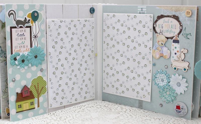 Альбом ручной работы для мальчика с множеством различных украшений на каждой странице. Формат альбома 20х20, внутри 10 декорированных страниц, рассчитан до 50 фотографий, надписи в альбоме на английском языке.
