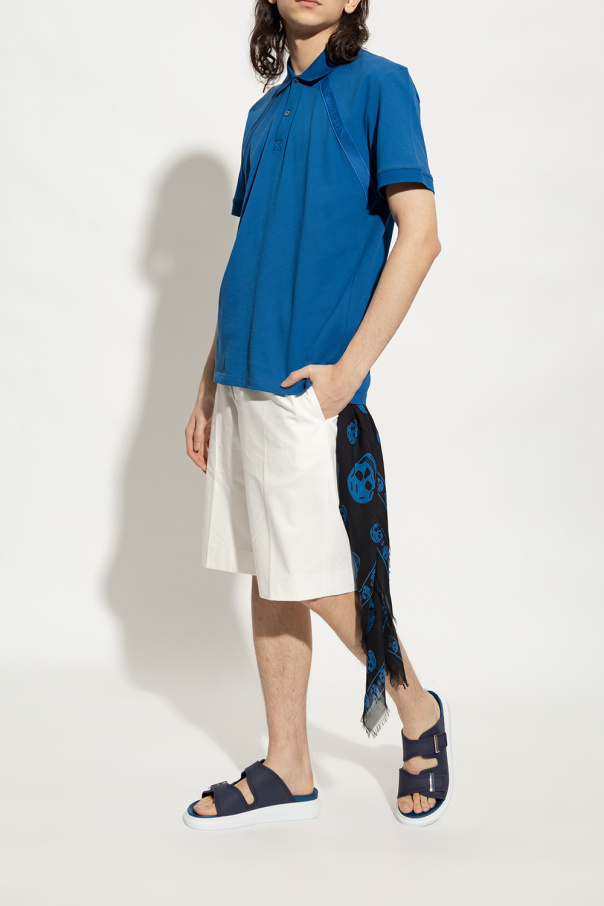 Blue and navy blue slides from Alexander McQueen. Sitting on a white rubber sole, this model showcases silver-tone metal hardware with an embossed logo.