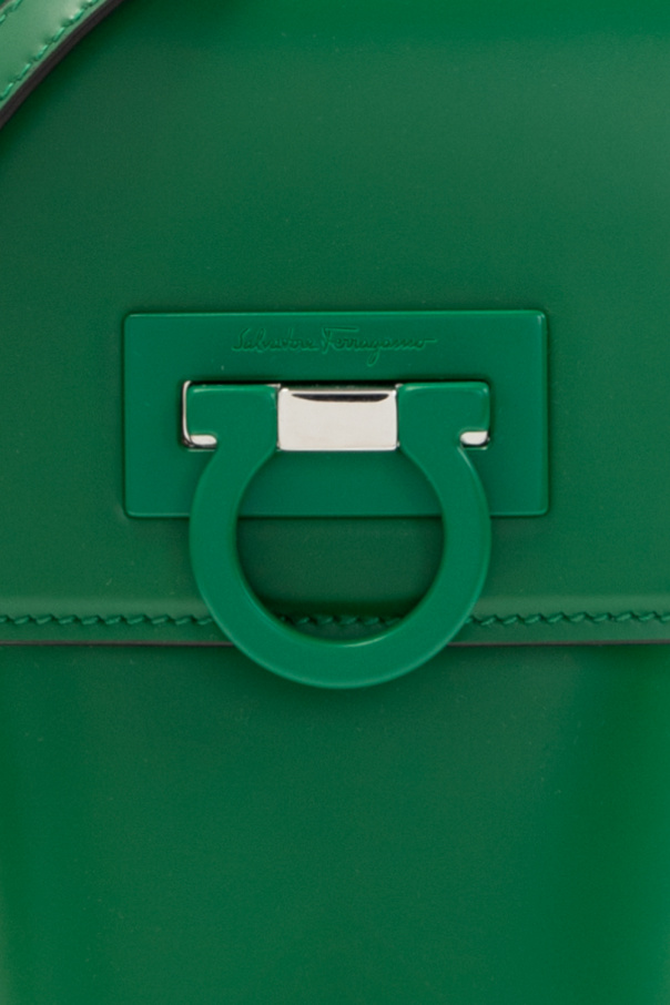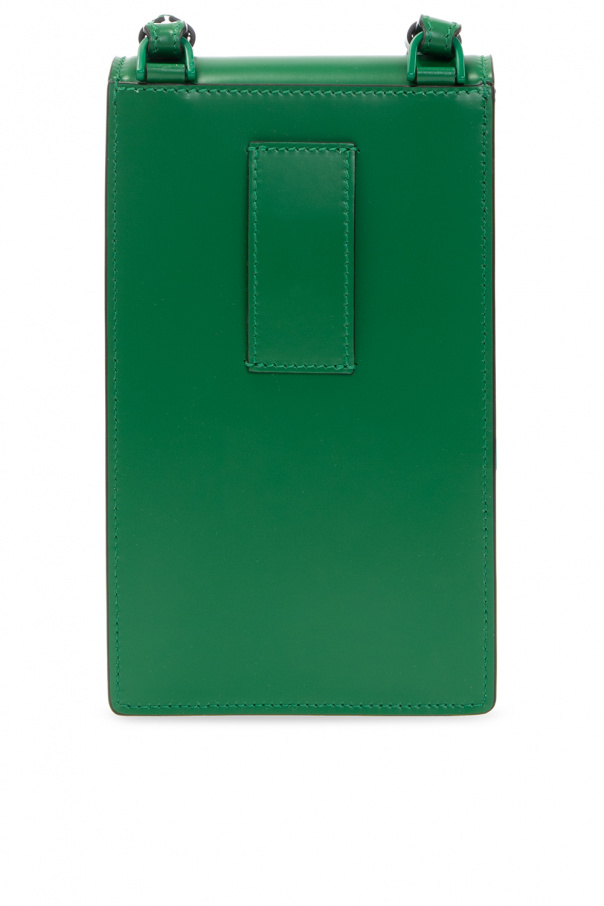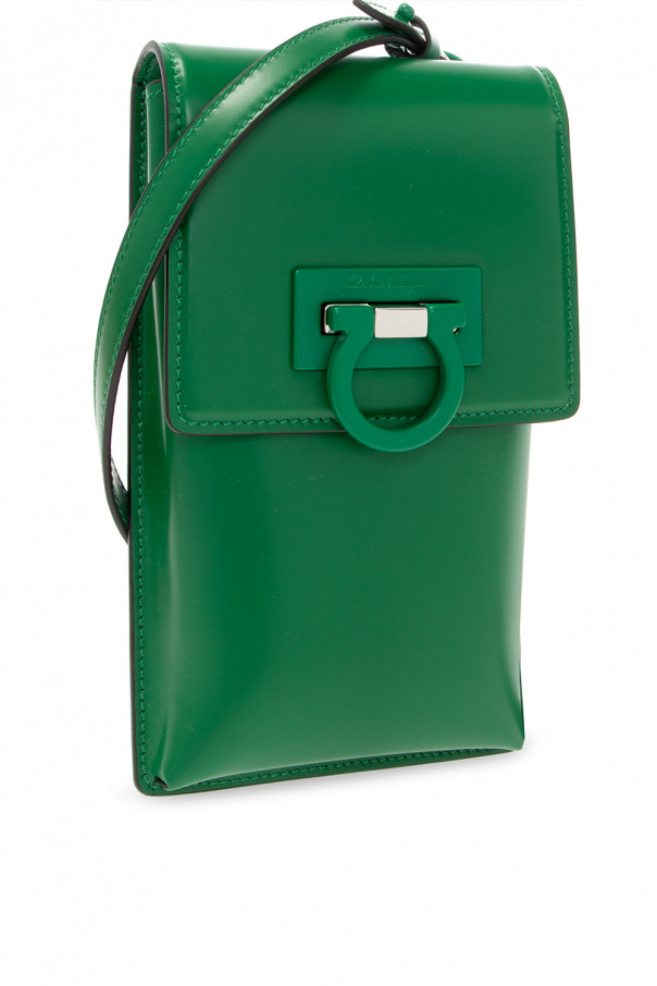 Green phone holder from Salvatore Ferragamo. Made of calf leather, this model fastens with a snap and features a logo appliqué, adjustable strap, silver-tone and green metal hardware and one internal compartment with three slip pockets.