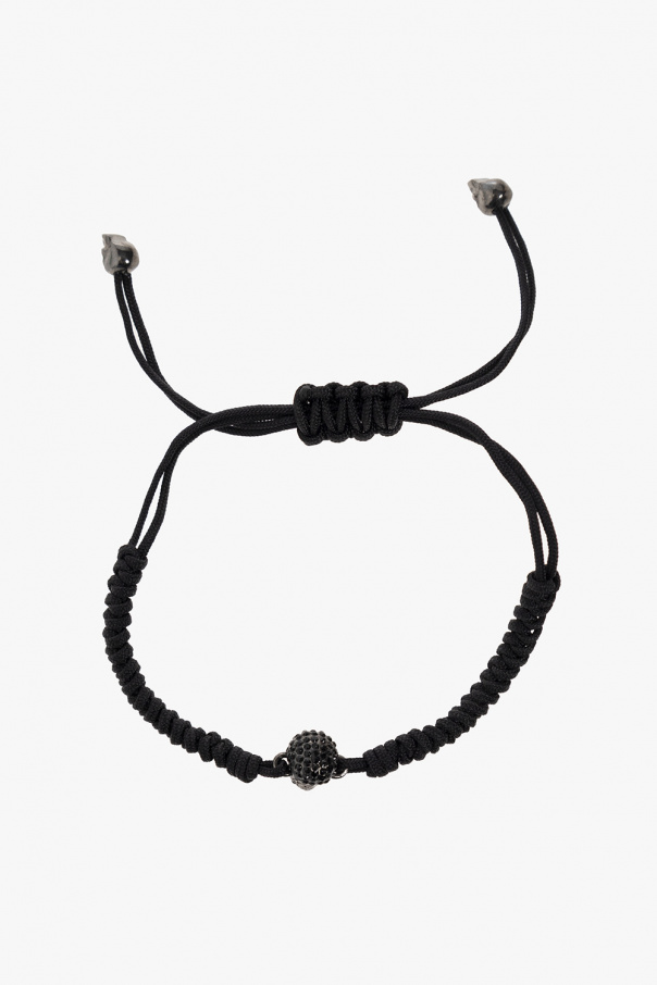 Black bracelet from Alexander McQueen. Crafted from braided cotton cord, this item showcases brass skull pendants – one is bejewelled with glossy crystals.