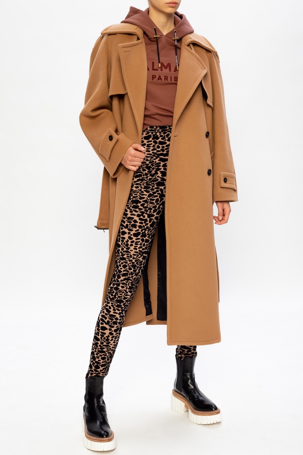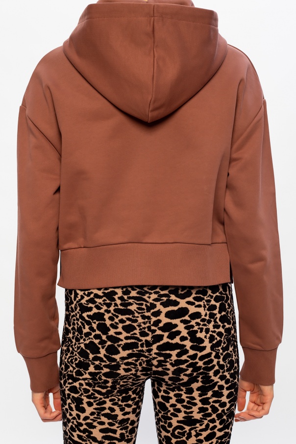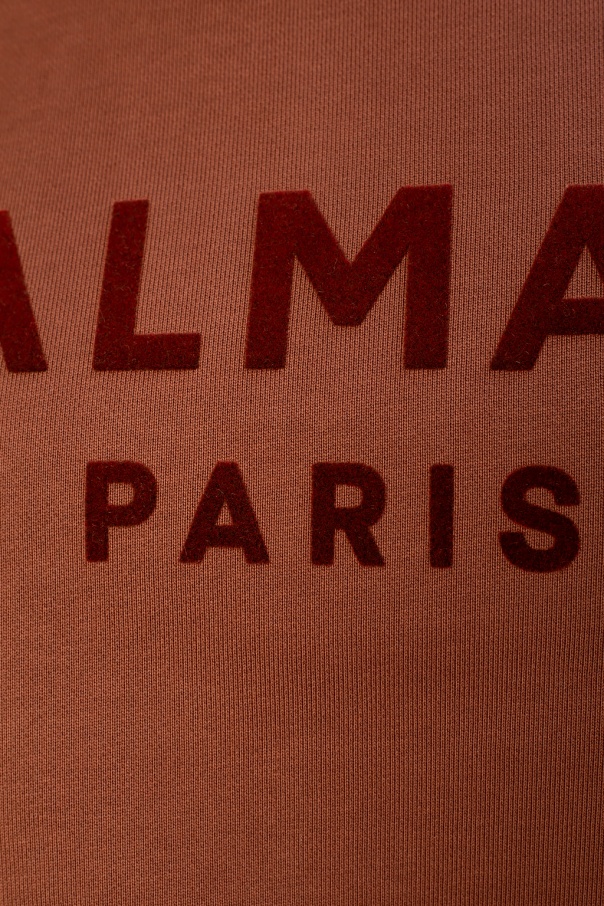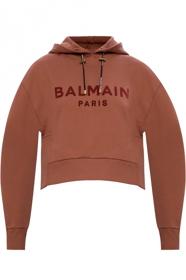 Brown sweatshirt with a drawstring fastening from Balmain. Cut from cotton jersey, this style features velvet flocked appliqué with the label\'s logo, side vents, rib-knit trims and gold-tone metal hardware.