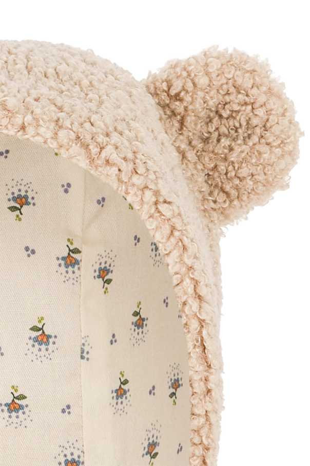 Beige hat from Konges Slojd. Made in teddy polyester, this item ties under the chin and features bear ears.