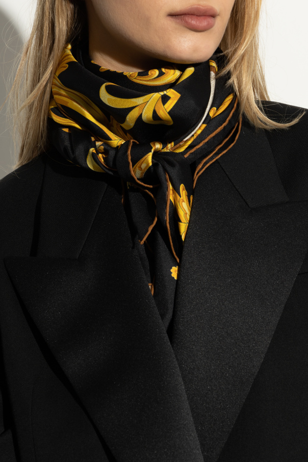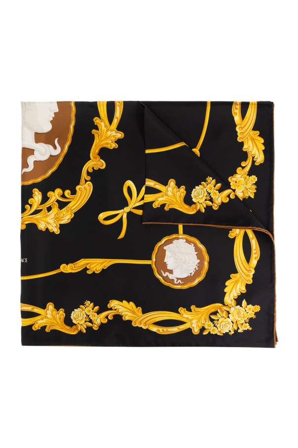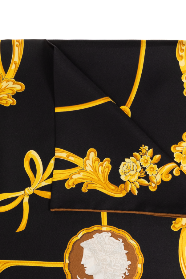 Presenting the luxurious Silk Scarf by Versace, a masterpiece that epitomizes elegance and sophistication. This exquisite accessory features a dominant black hue adorned with a lavish baroque pattern in opulent golden tones. The design showcases intricate floral ornaments and medallion motifs with profiles, symmetrically balanced to exude an aura of refined elegance. Crafted from the finest silk, the scarf boasts a smooth and lustrous finish, a testament to its superior quality. Its versatility is unmatched, seamlessly complementing both women\'s and men\'s attire, making it an essential addition to any wardrobe. Versace, founded by Gianni Versace in 1978 and now led by Donatella Versace and Emmanuel Gintzburger, is renowned for its fusion of classic and contemporary influences, Italian tradition and innovation, creating legendary fashion moments. Why Choose This Product? Crafted from 100% luxurious silk for a smooth touch. Features an elegant baroque pattern with gold accents. Versatile design suitable for any ensemble. Iconic brand known for its innovative Italian craftsmanship.