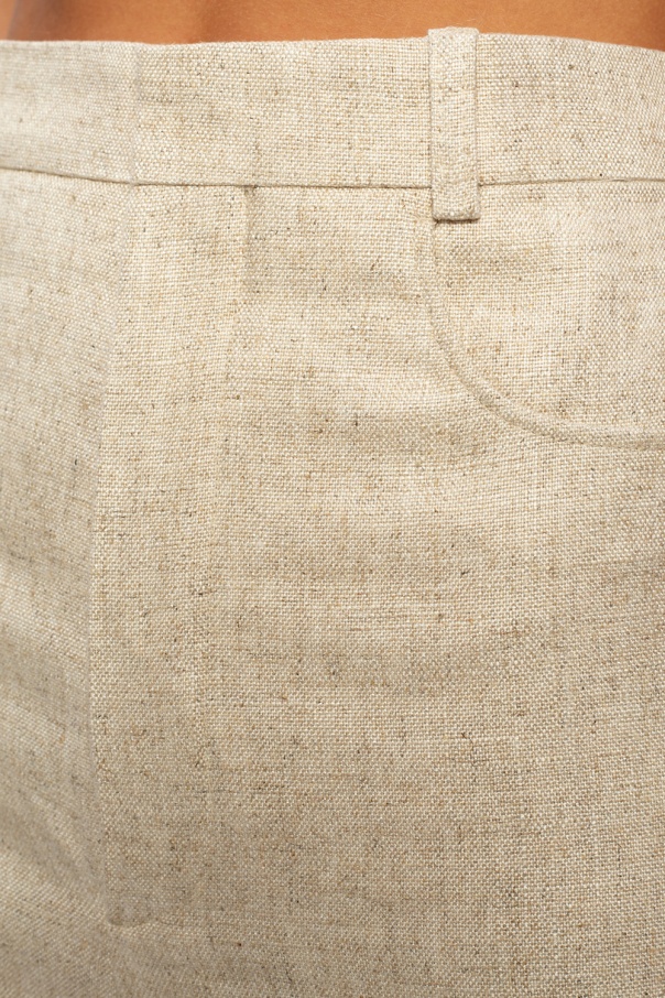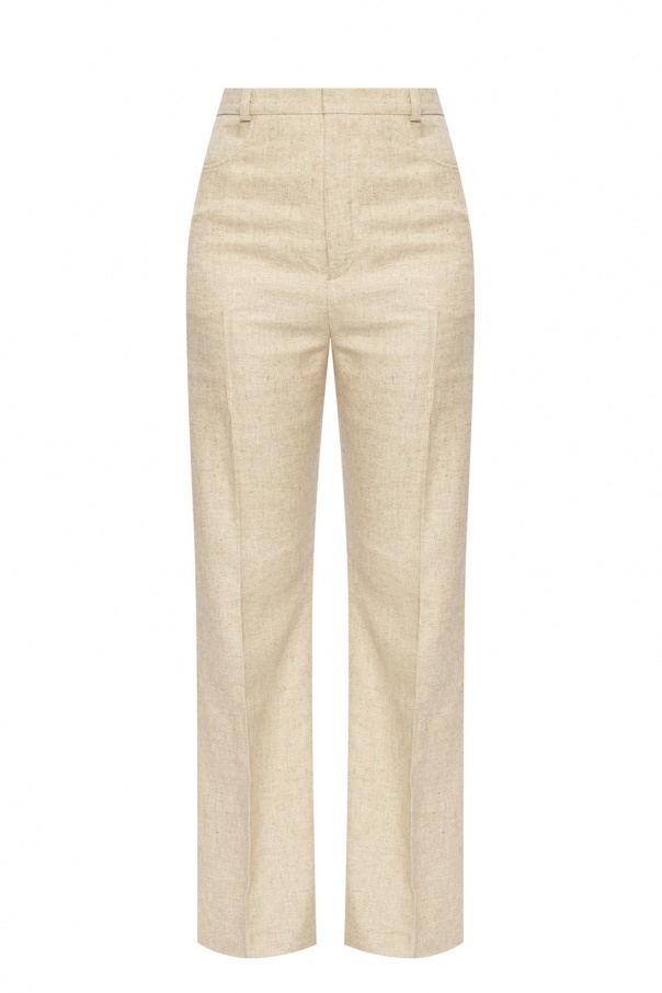 Cream trousers from Jacquemus. Crafted from linen into a high-waisted silhouette with flared legs and floor length, this pair features zip fly, hook and button closures and four pockets.