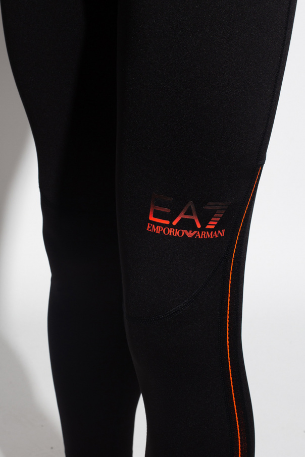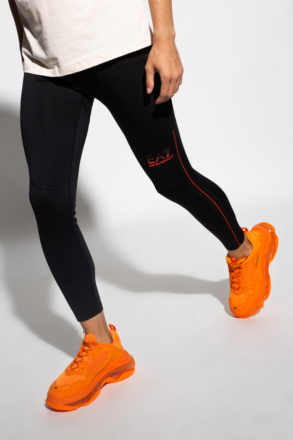 Black leggings from EA7 Emporio Armani. Featuring an elastic waistband, this pair falls down with tapered legs and is decorated with a printed logo pattern in orange and decorative side stripes.