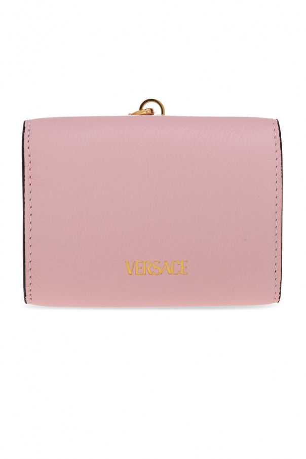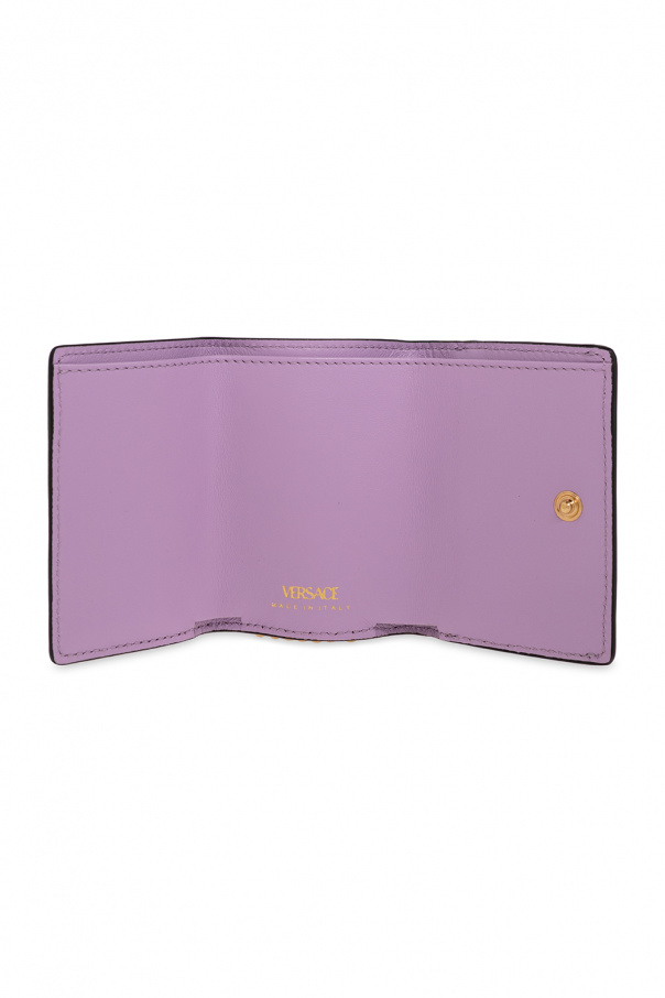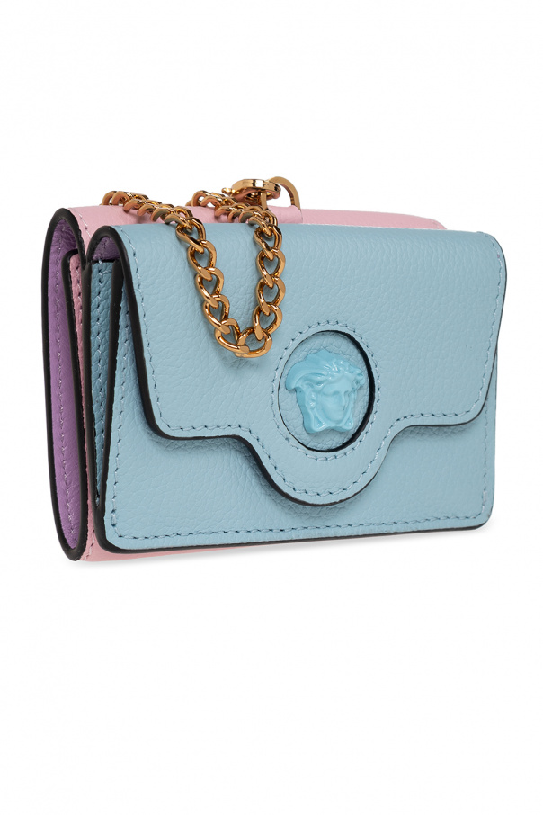 Blue, pink and purple wallet from Versace. Crafted from leather, this model features a snap closure, the label’s signature Medusa head applique, snap-fastened coin pocket, detachable chain and gold-tone metal hardware as well as a bill compartment and three card slots inside.