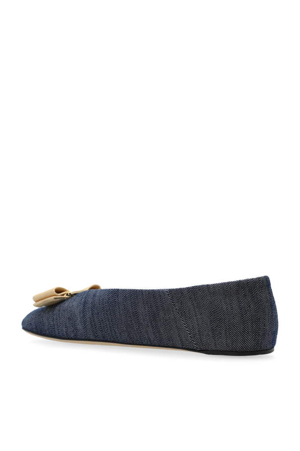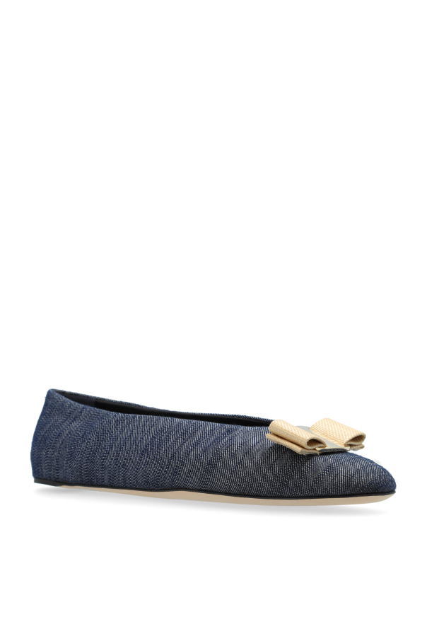 Introducing the \"Vanna Den\" ballet flats by FERRAGAMO, a harmonious blend of comfort and refined style destined for the discerning fashion enthusiast. Crafted with a keen eye for detail, these mid-heel shoes are a testament to the elegance that lies in simplicity. The dominant blue hue, complemented by a subtle horizontal ribbing in the textile upper, encapsulates a casual yet sophisticated aesthetic. The defining feature of these flats is the ornamental flat bow on the upper, rendered in a contrasting light shade, possibly beige or gold, that not only adds a touch of uniqueness but also serves as a subtle nod to the brand\'s iconic logo. The rounded toe and flat sole design adhere to the traditional ballet flat silhouette, ensuring a seamless fusion of form and function. The interior\'s smooth leather lining prioritizes comfort, allowing for an enjoyable wearing experience throughout the day. Meanwhile, the thin leather sole provides a modicum of cushioning, ensuring ease of movement without compromising on style. These characteristics make the \"Vanna Den\" ballet flats an ideal choice for those seeking footwear that marries everyday comfort with a flair for elegance, be it for regular wear or special occasions requiring a chic but relaxed dress code. Why Purchase This Product? Exclusive Design: The unique bow application and the sophisticated color scheme set these flats apart. Unmatched Comfort: Crafted with a smooth leather interior and a wide insole, these shoes promise all-day comfort. Versatile Style: Perfect for both everyday wear and special occasions, complementing a variety of outfits. Quality Materials: Constructed with a textile upper and a leather inner lining and sole, ensuring durability and a premium feel.