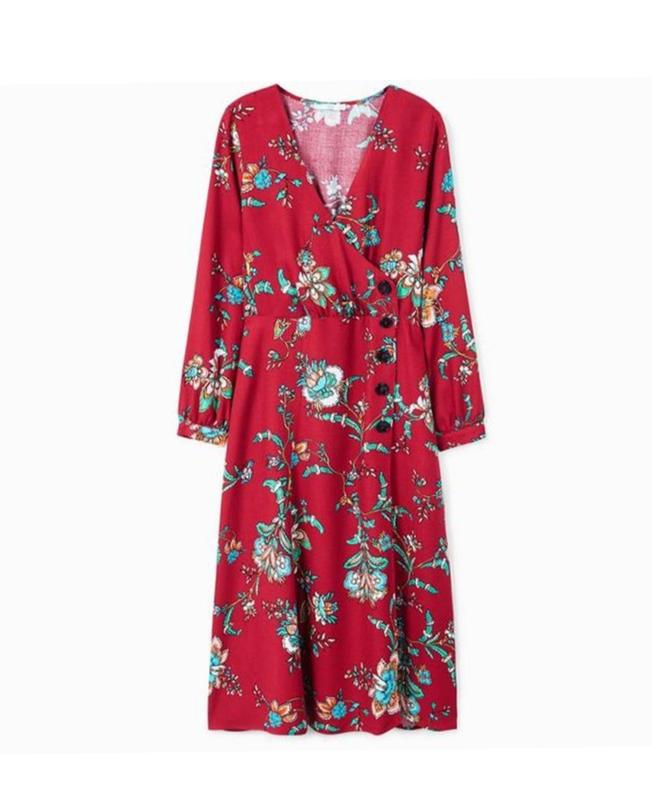 Восхитительное натуральное платье Mango в цветочный принт. Платье расширенного силуэта, спереди на юбке разрез, сбоку молния, пуговицы не разстегиваются.