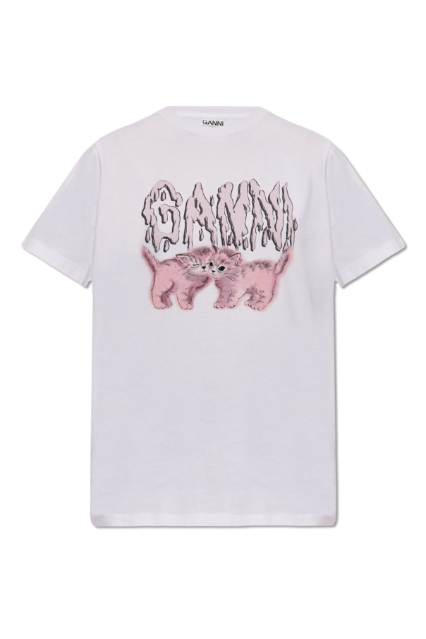 White crewneck T-shirt from Ganni. Made from organic cotton, this style showcases a pink and black graphic print with the brand\'s logo and cats on the front, short sleeves and ribbing on the collar.