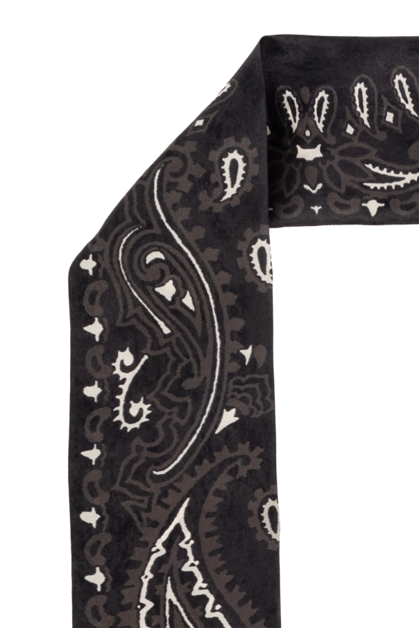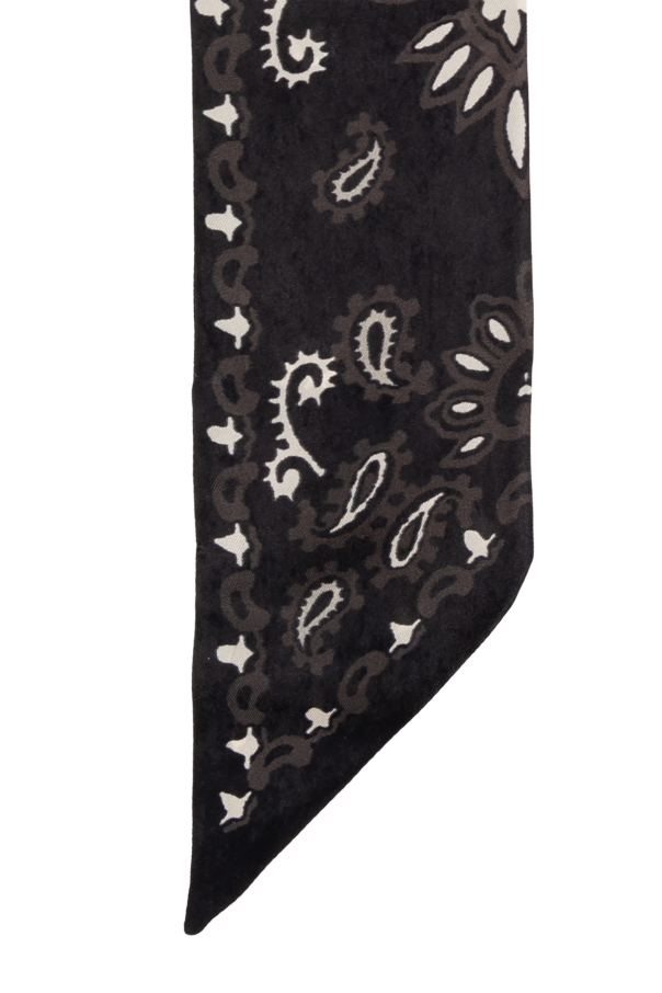 Introducing the epitome of sophistication and timeless style: the Silk Scarf by Golden Goose. Crafted from the finest 100% silk, this exquisite accessory boasts a classic paisley pattern set against a rich black backdrop, interwoven with delicate shades of white and grey. The intricate plant and curvilinear motifs create a striking contrast, exuding an air of luxury and exclusivity. The scarf\'s slender and elongated design allows for versatile styling, ensuring it becomes a staple in your wardrobe, adaptable for any occasion. Renowned for its smoothness, luster, and soft touch, silk is also celebrated for its thermal regulatory properties, making this scarf a comfortable choice throughout the seasons. Notably absent of overt branding, this piece speaks volumes of the Golden Goose brand\'s commitment to elegance and refined design. Its minimalist approach to branding emphasizes the premium quality of the material and craftsmanship, making it a true mark of luxury. Viewed in context on a model, the scarf\'s proportions and styling versatility come to life, offering inspiration for its myriad of potential looks. This aspect is particularly beneficial for discerning clients considering this sophisticated accessory. Why Purchase This Product? Luxurious 100% silk material, known for its unparalleled softness and sheen. Classic paisley pattern in a versatile black, white, and grey palette, suitable for any ensemble. Elegant and subtle design with no overt logos, reflecting a sophisticated aesthetic. Long and narrow dimensions for diverse styling options. Thermal regulatory properties of silk make it an ideal accessory for any season.