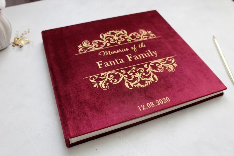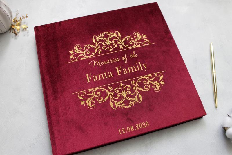 Яскравий оксамитовий фотоальбом винного кольору буде чудовим подарунком з нагоди весілля або річниці відносин. Альбом можна замовити для дочки з нагоди заручин або весілля, подарувати чоловіку чи порадувати дружину.