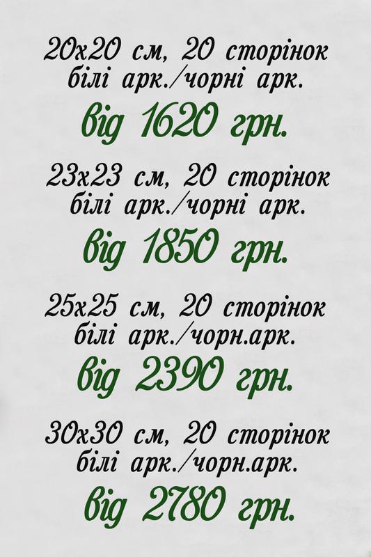 13х18 см - 40-80 шт.Вартість вказано за альбом на 10 аркушів (20 сторінок) розмір 23х23 см.
