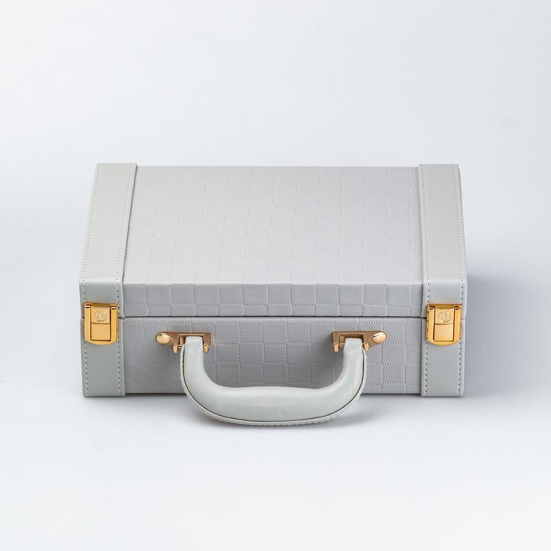 Размеры шкатулки составляют 27 х 18.5 х 9 см, а использование экокожи придает