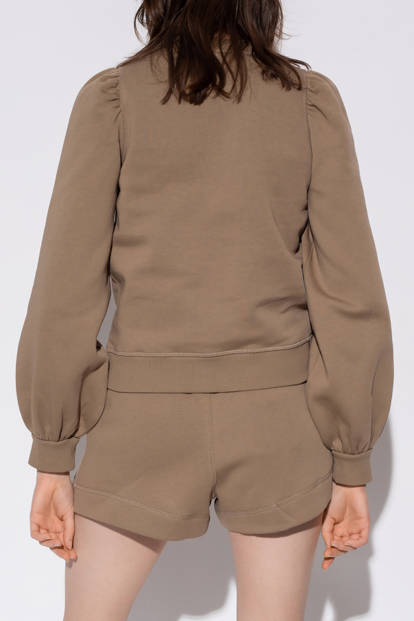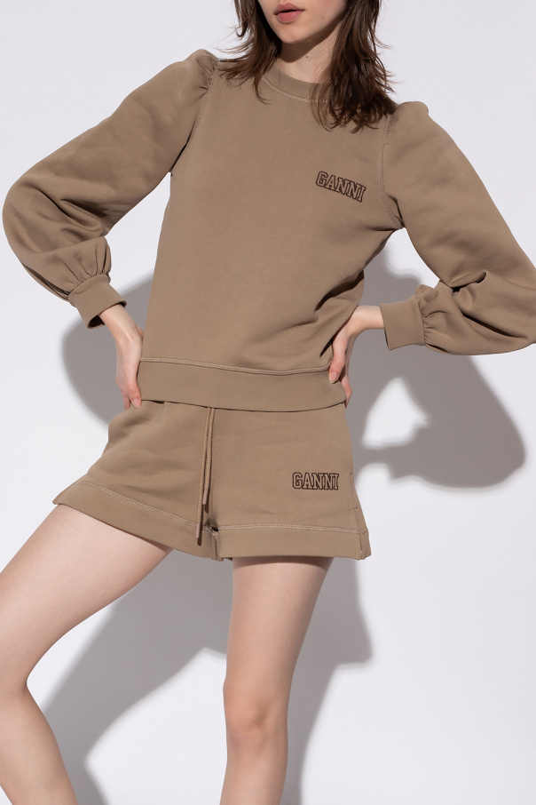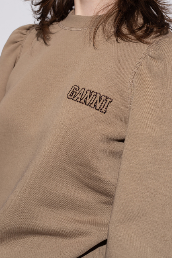Light brown sweatshirt with puff sleeves from Ganni. Made of organic cotton from sustainable farms, this garment features a brown logo embroidery and ribbed trims at the neck and cuffs.