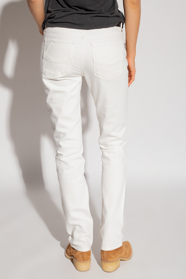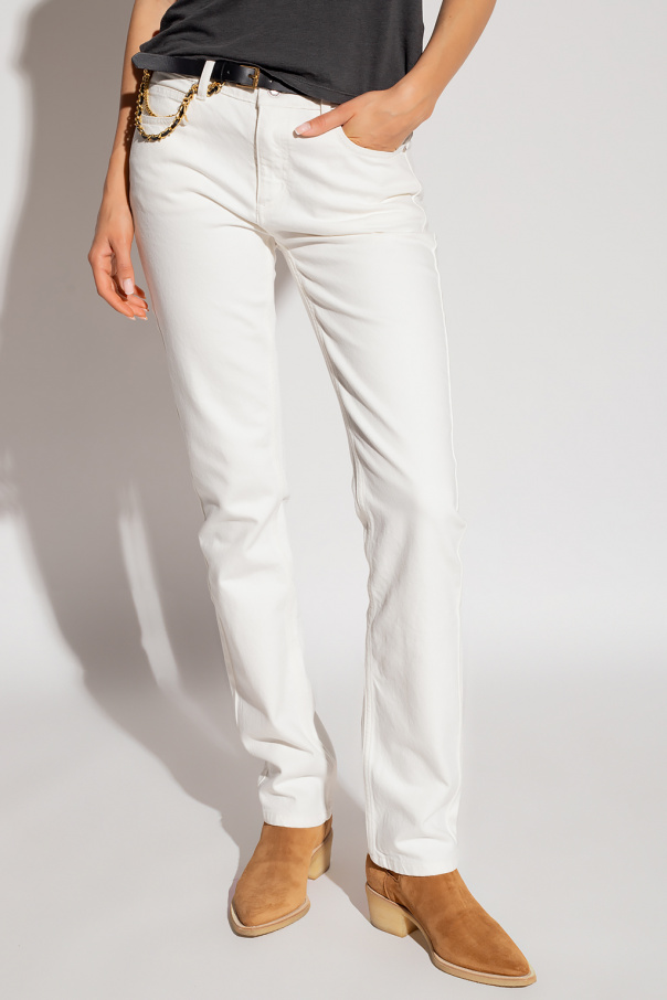 White ‘Clint’ jeans from Zadig & Voltaire. Fastened with a zip and button, this pair is complete with an embroidered ‘ZV’ motif, metal appliqué, logo-embossed patch at the back, five slip pockets and straight legs.