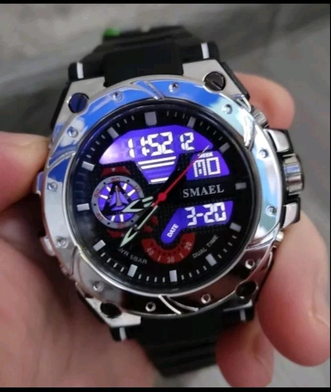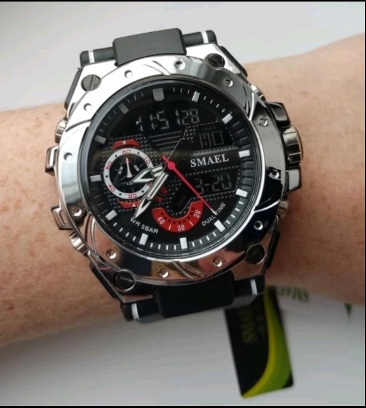 Новые. В упаковке. Тактические водонепроницаемые часы Smael. В черном цвете со стальным корпусом. Механизм стрелочно-цифровой. Просто шикарная современная модель. Светодиодная подсветка, функция хронометра, будильник,календарь, двойной часовой пояс, водонепроницаемость до 50 м. Противоударный дисплей, корпус нержавеющая сталь, прорезиненный ремешок,на любой объем запястья. Смотрятся шикарно на мужской руке. Объемные и большие.