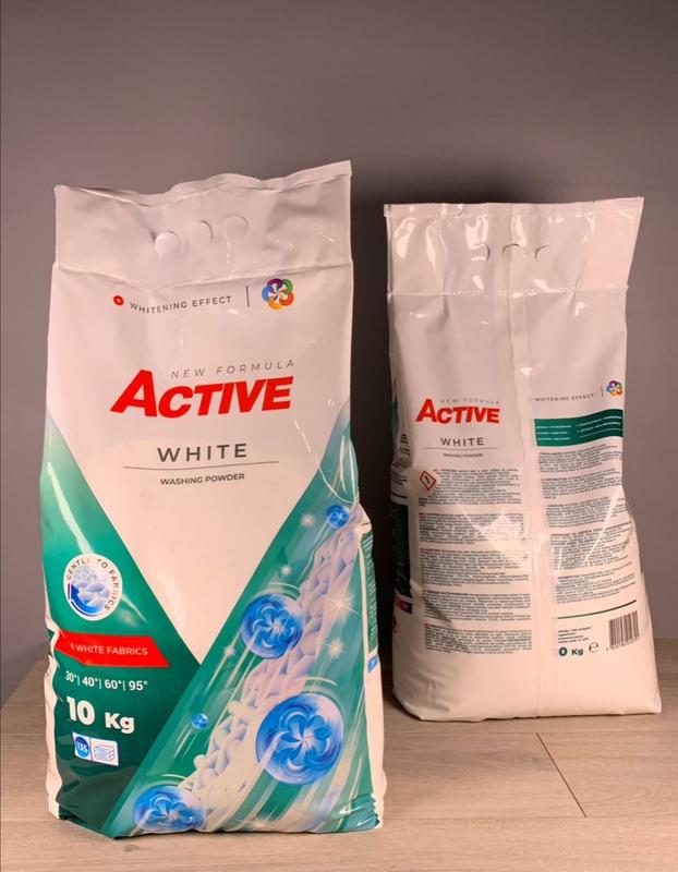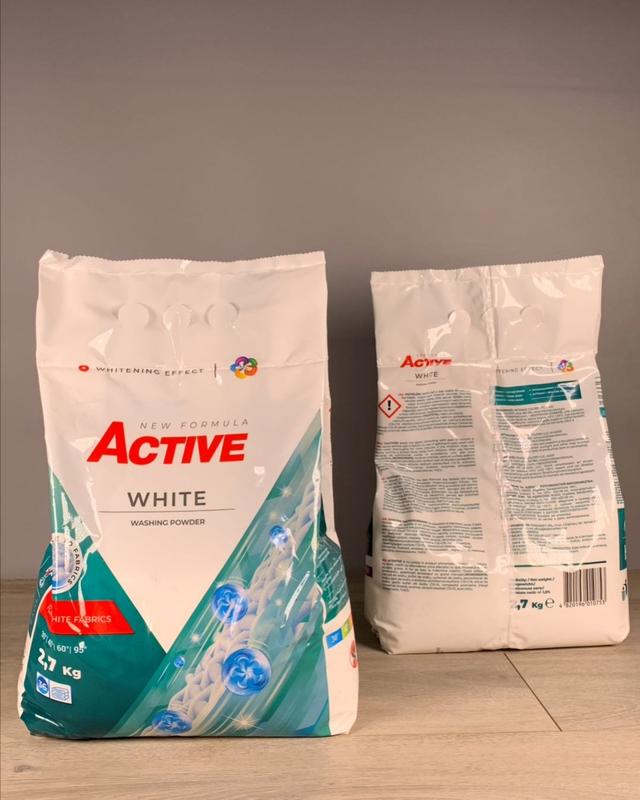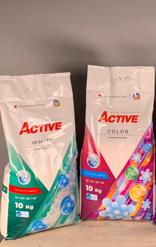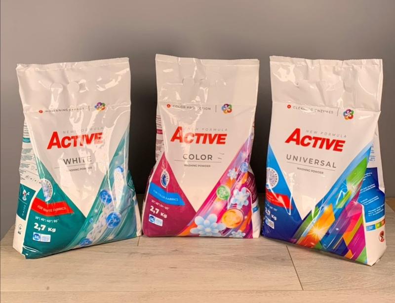Пральний порошок Active допоможе вам упоратися з таким складним завданням, як прання для всієї родини. Він чудово видалить плями, додасть свіжості вашим речам, а коштує недорого! І все це в одній пачці. Уся родина буде щаслива! Чистота, свіжість, аромат — без зайвих витрат! Завдяки Active більше немає потреби витрачати зайві гроші, щоб Ваші речі були чистими та свіжими! До складу також входять компоненти, що запобігають накипу, що важливо для продовження терміну експлуатації пральної машини.