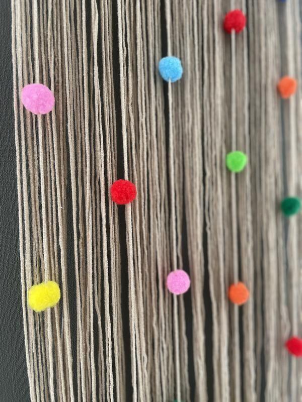 Макраме панно с декоративными помпонами. Размер: ширина 35 см, высота 90 см. Подойдет в детскую комнату или ярким элементом в спокойном интерьере.