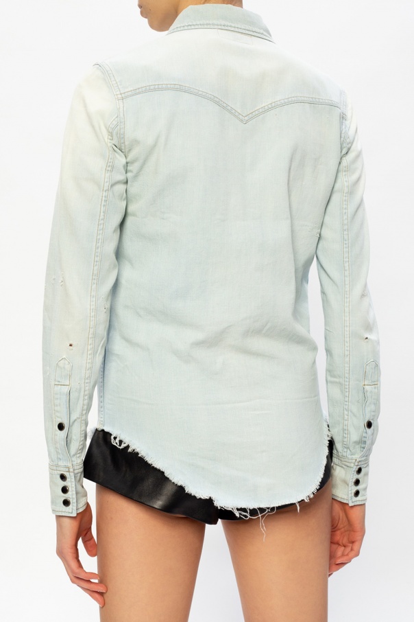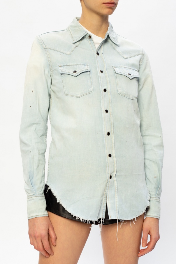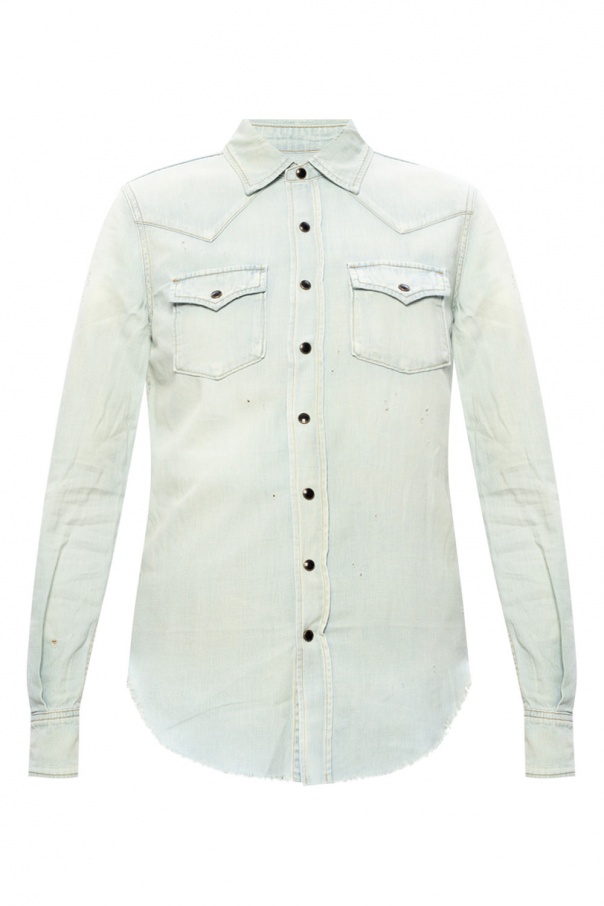 Light blue distressed denim shirt from Saint Laurent. Fastened with decorative snap buttons, this long sleeve design features a raw edge and two snap-fastened flap pockets.