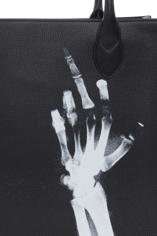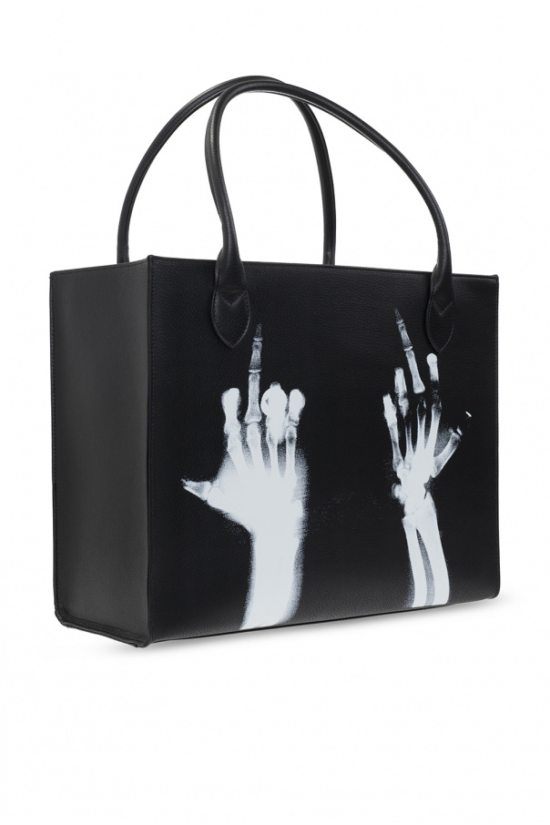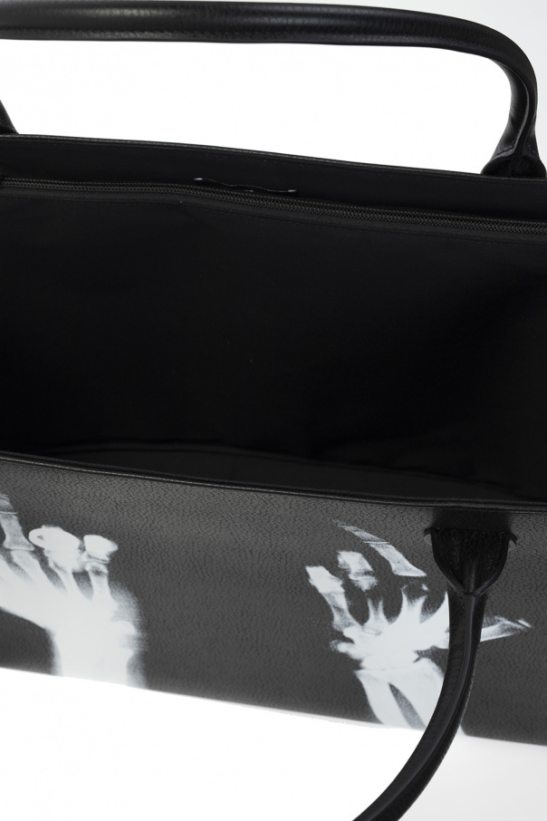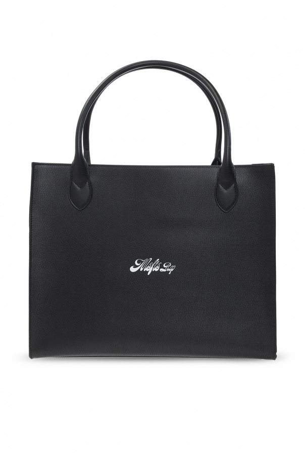 Black shopper bag from MSFTSREP. Embellished with a graphic print and the brand's logo in white, this design features two half-round handles and an interior with two sections and a zipped compartment.