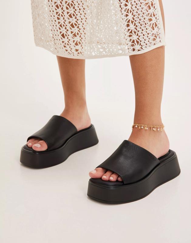 Шлепанцы Vagabond Courtney изготовлены из гладкой черной кожи, мягкой кожаной стелькой и квадратными носками на широкой платформе, высота платформы 5 см.