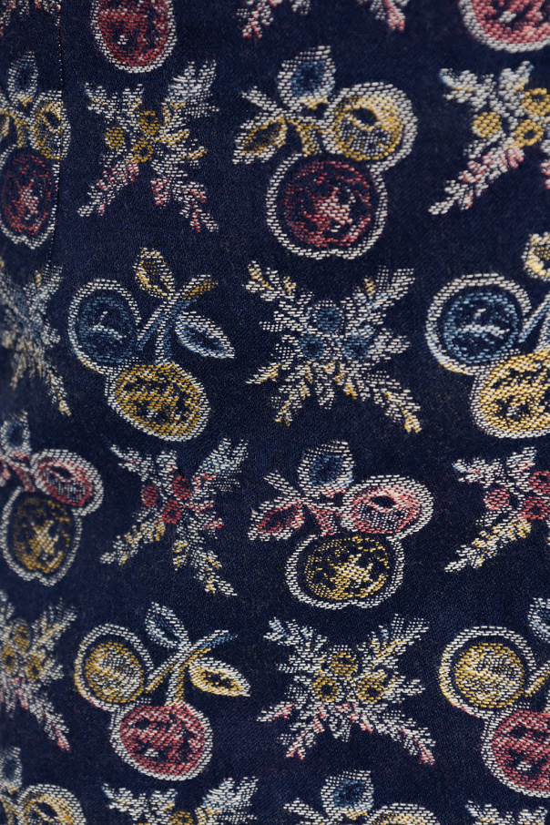 Navy blue mini skirt from Etro. Embellished with a colourful jacquard pattern with a motif of fruits, this style features a hidden side zipper with a hook & eye closure and a frontal slit for walking ease.