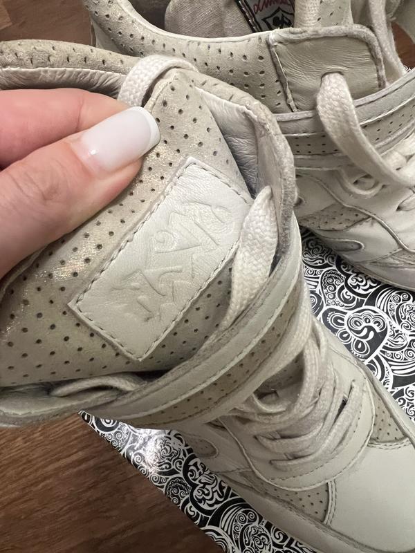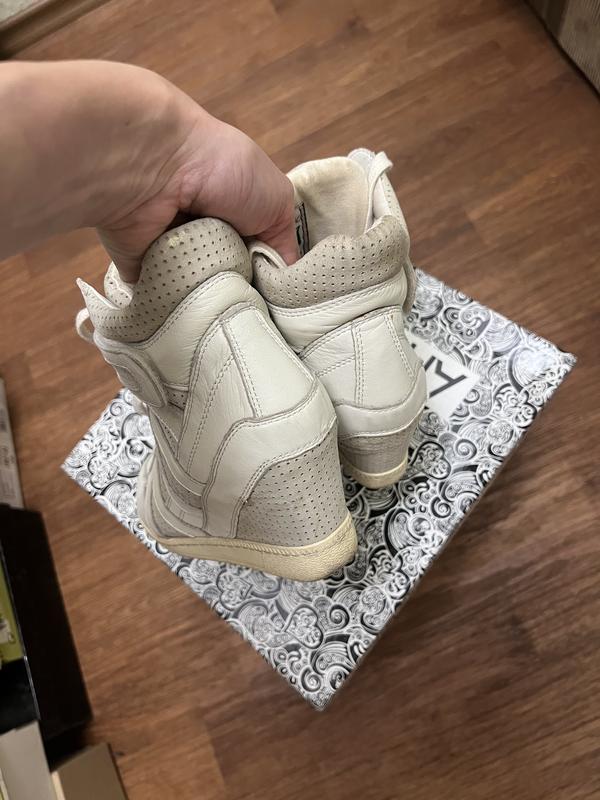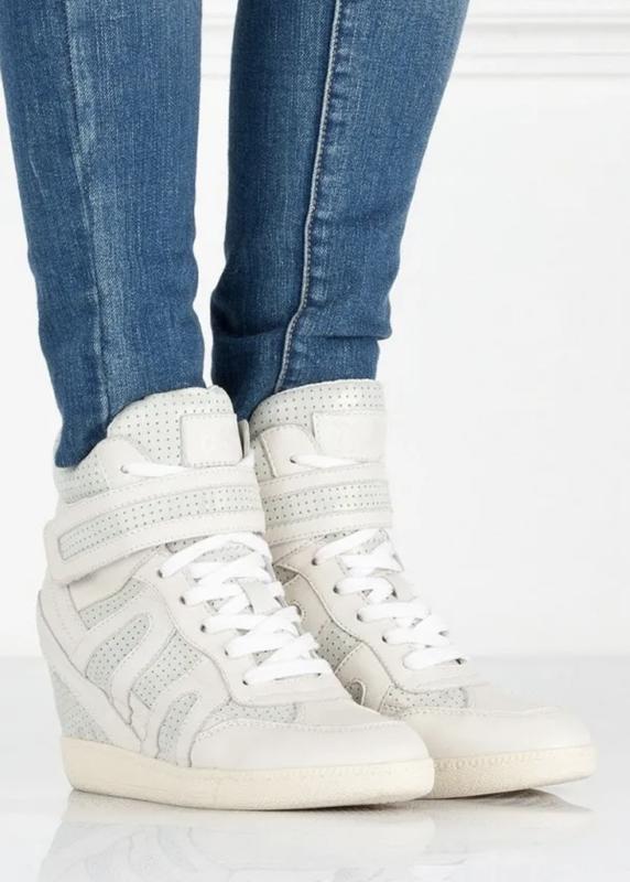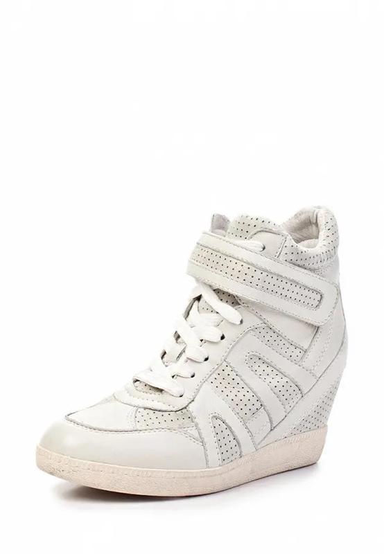 Кеды (сникерсы) на танкетке от ASH. Модель выполнена из гладкой натуральной кожи со вставками из перфорированной ткани. Особенности: дополнительная застежка на липучке, плоская резиновая подошва.