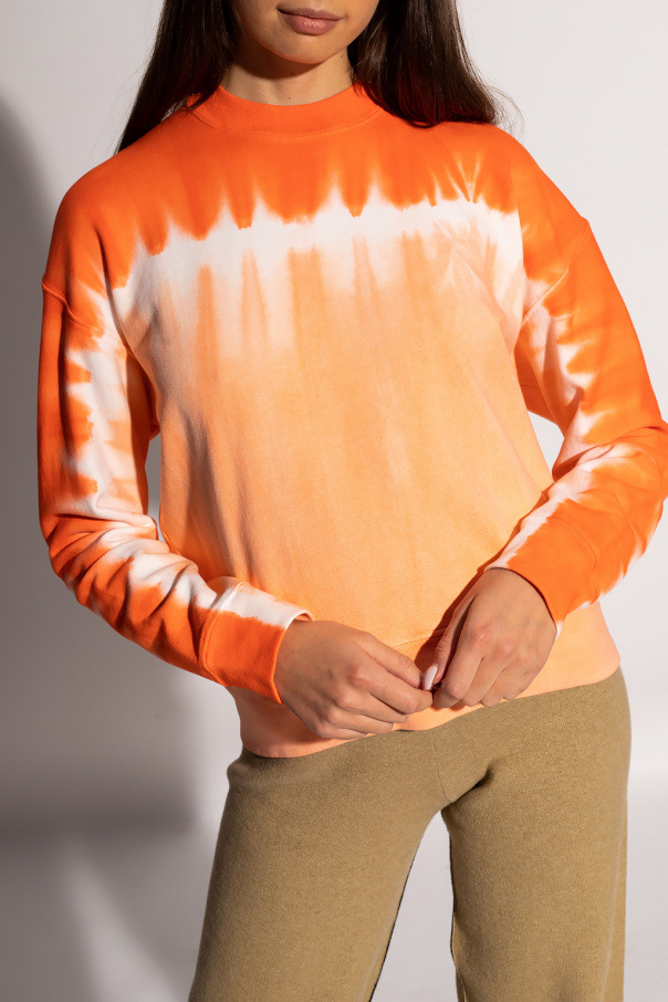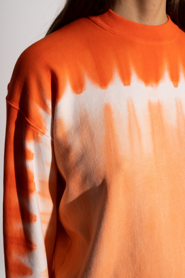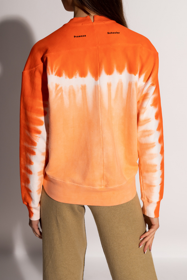 Orange and white crewneck sweatshirt from Proenza Schouler White Label. Crafted from tie-dyed cotton jersey, this style showcases a black logo print on the back and ribbed trims on the edges.