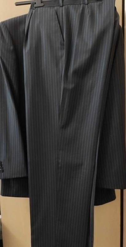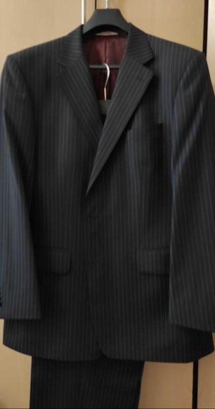 Шикарный мужской костюм от Михаила Вороконина. В отличном состоянии-практически новый. Ткань темно-синяя в мелкую полоску. Размер 52-54, размер брюк по талии-92 см, длина брюк по внешнему шву-108 см. Подкладка цвета бордо. Пиджак однобортный на две пуговицы с двумя шлицами.