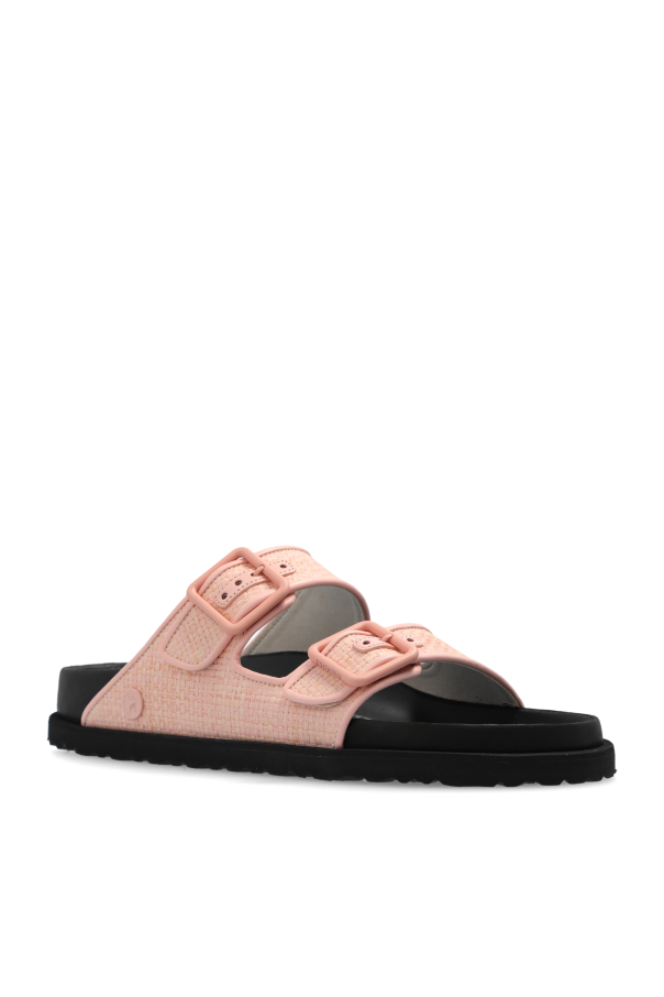 Introducing the Arizona Raffia Slides in a delicate blush pink, a testament to the innovative craftsmanship of Birkenstock 1774. These slides boast a unique construction with two wide, textile straps featuring an intricate raffia-like weave, complemented by adjustable buckles for a tailored fit to your foot. The essence of elegance and comfort, these slides are underlined by a robust black rubber sole, ensuring stability and longevity. The interior reveals a thoughtful design, with a leather and textile lining for supreme comfort and breathability. Each slide is carefully marked with the size and distinguished Birkenstock 1774 branding, signifying authenticity and premium quality. The narrowed footbed design is a subtle nod to contemporary aesthetics, blending seamlessly with the practicality and stylish allure of the exterior. Why Purchase This Product? Exclusive Design: The Arizona Raffia\'s distinctive texture and soft pink hue offers a modern twist on a classic silhouette. Adjustable Comfort: Dual straps with customizable buckles ensure a perfectly snug fit, adapting to your foot\'s unique shape. Superior Craftsmanship: A commitment to quality is evident in the meticulous construction and choice of premium materials, including a 100% rubber sole for unmatched durability. Elegant Versatility: Whether paired with casual wear or as a chic complement to summer dresses, these slides promise to elevate any ensemble.
