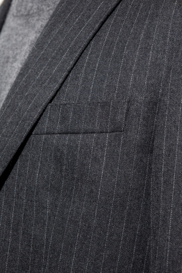Dark grey ‘Pitea’ single-breasted blazer from Iro. Crafted from wool, this garment features button fastenings, white pinstripe pattern, two flap pockets, one slip pocket, single rear vent and long sleeves with banded cuffs.