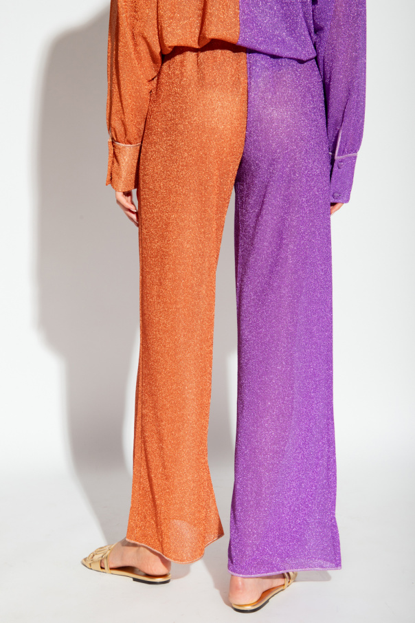 Purple and orange trousers from Oseree. Inlaid with lurex yarn, this pair features a high-waisted silhouette, an elasticated waistband and relaxed-fitting, straight legs.