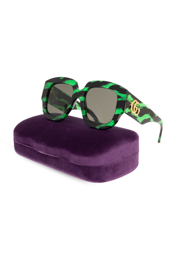 Introducing the epitome of sophistication and contemporary design: the Gucci Green-Black Sunglasses. Crafted with meticulous attention to detail, these sunglasses feature a striking green frame with a distinctive, contrasting pattern that evokes an abstract or camouflage motif. The iconic \"cat-eye\" shape, with its subtly pointed corners, merges classic elegance with modern flair, making these sunglasses a must-have accessory for the fashion-forward individual. The frames are constructed from 100% acetate, ensuring both durability and a luxurious finish. Each pair boasts grey lenses that provide 100% UV protection, shielding your eyes with unparalleled efficacy. The sunglasses are adorned with a golden metal logo at the temple, a testament to the Gucci legacy of luxury and high fashion. This logo not only signifies authenticity but also adds an exquisite touch of elegance against the vibrant green backdrop. Accompanying each pair is a randomly selected colored case, indicating that these sunglasses are part of an exclusive collection. The case, in its rich purple hue, complements the sunglasses, providing a stylish and secure way to protect your investment. Close-up images reveal the intricate detailing of the golden logo, showcasing the meticulous craftsmanship and refined aesthetic that Gucci is renowned for. These square-framed sunglasses are embellished with a pattern finished with shimmering glitter, and the wide temples feature the metallic appliqué in the shape of the iconic Gucci logo. Why Purchase These Sunglasses? Unmatched style and sophistication with Gucci\'s signature design. High-quality materials and construction, ensuring longevity and comfort. Effective 100% UV protection for your eyes. Exclusive accessory and protective case included, enhancing the luxury experience. Unique pattern and color scheme, making these sunglasses a standout fashion statement.