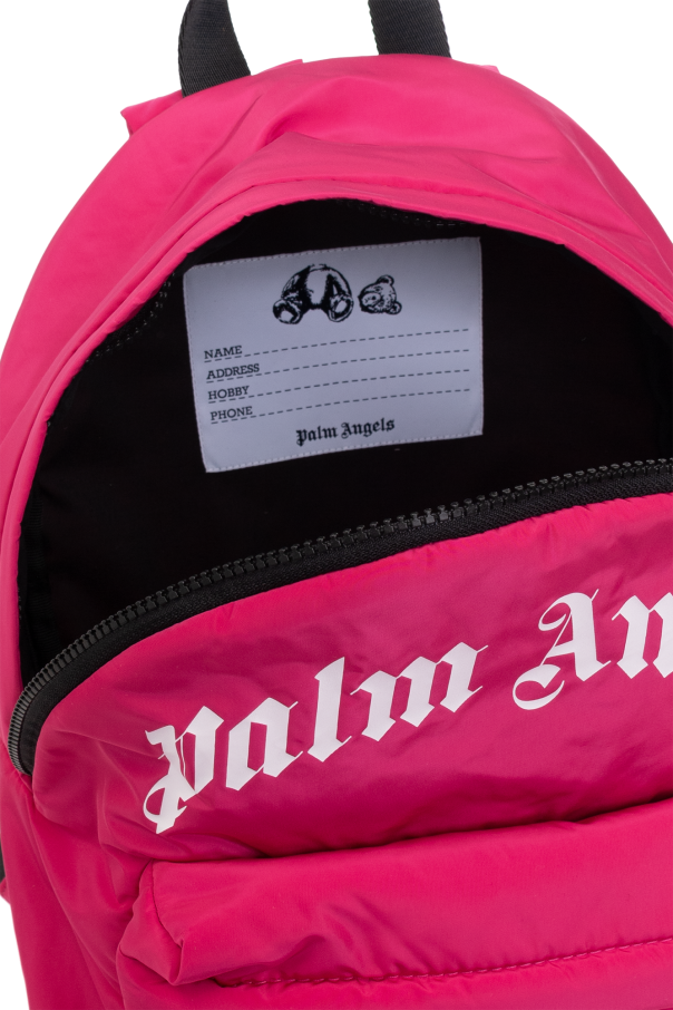 Pink backpack from Palm Angels Kids. Made of fabric, this design features a zip fastening, printed white logo, zip pocket on the front, black trims, half-round handle, adjustable shoulder straps and one internal compartment.