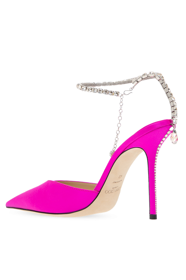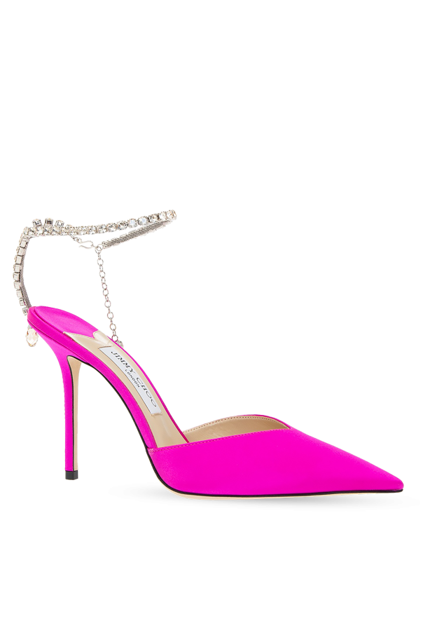 Pink ‘Saeda 100’ stiletto pumps from Jimmy Choo. Set on a beige leather sole, this pair boasts a pointed toe silhouette with a chain strap at the ankle enriched with a glistening jewellery-like adornment.