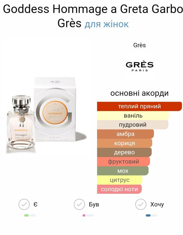 Goddess Hommage a Greta Garbo від Grès - це парфум для жінок, належить до групи ароматів Шипрові Квіткові. Парфумер: Marie Salamagne. Верхні ноти: Кардамон, Слива і Мандарин; ноти серця: Кориця, Геліотроп і Жасмин; ноти бази: Амбра, Ваніль, Дубовий Мох і Сандал. Ємкість-60мл.