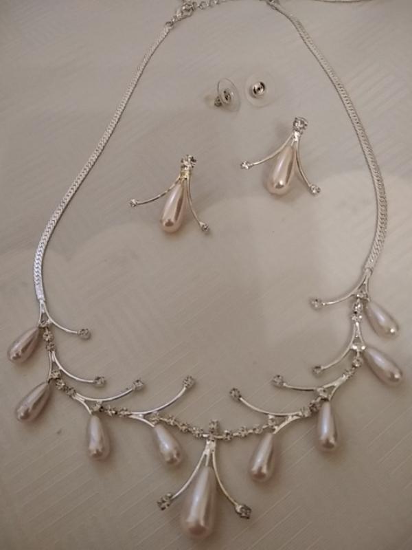 (ПР23) )Святковий набір кольє: із сережками -цвяшками зі скла і металу білого кольору, і штучних перлин блідо-рожевого кольору