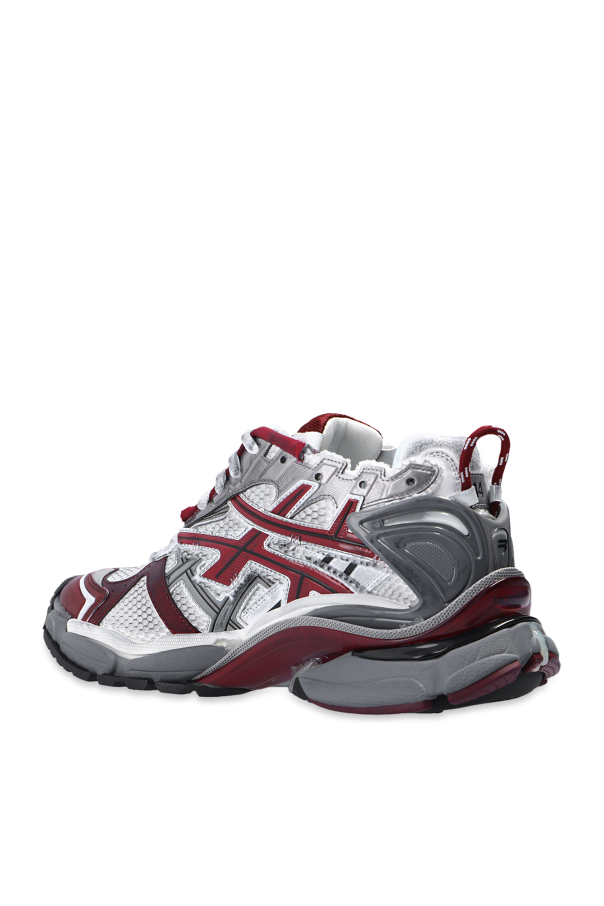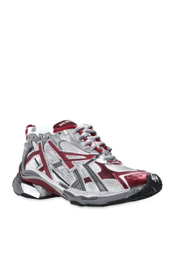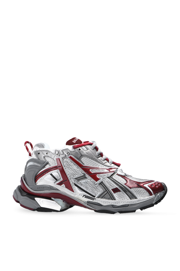 White, grey and maroon ‘Runner’ distressed sneakers from Balenciaga. Featuring a mesh upper, this pair is complete with a logo-embroidered tongue, raw cut edges, vintage effect and rubber sole in black, grey and maroon with transparent inserts.
