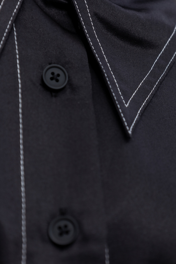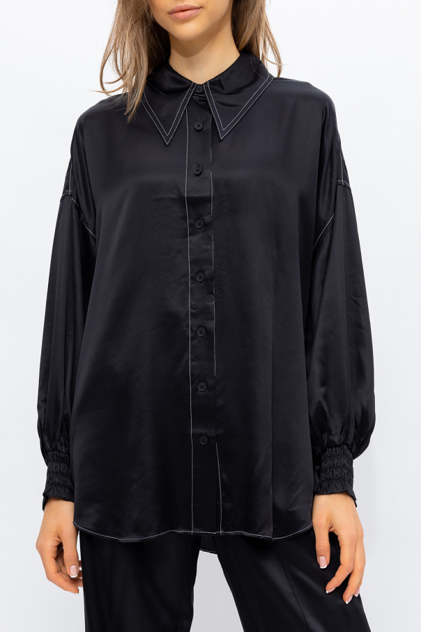 Black ‘Charli’ loose-fitting shirt from AllSaints. Crafted from a blend of ECOVERO and silk, this garment features button fastenings, white stitching details, metal logo-engraved appliqué at the back and long sleeves with ribbed cuffs.