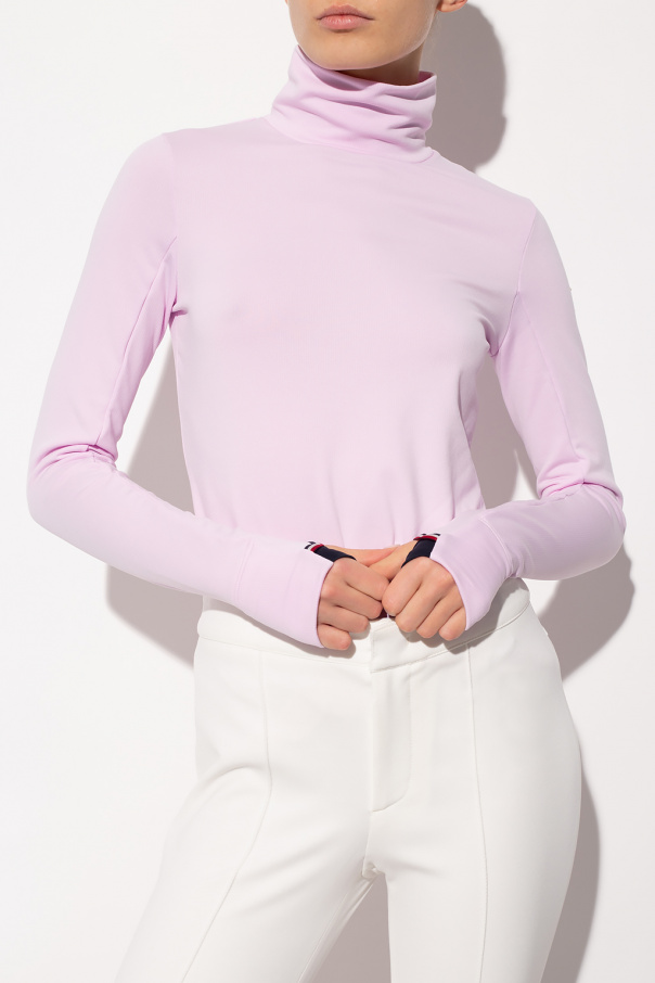 Light pink turtleneck sweater from Moncler Grenoble. Emblazoned with a cream, navy blue and red logo patch, this style features a snug collar, black fabric trims and long sleeves with elasticated cuffs.
