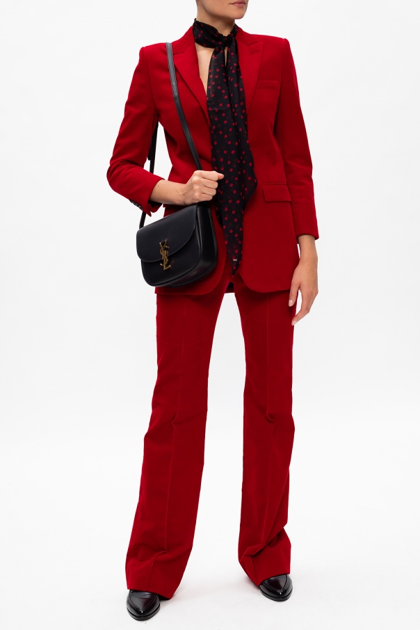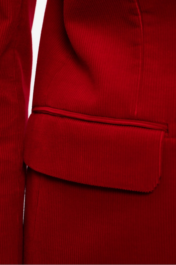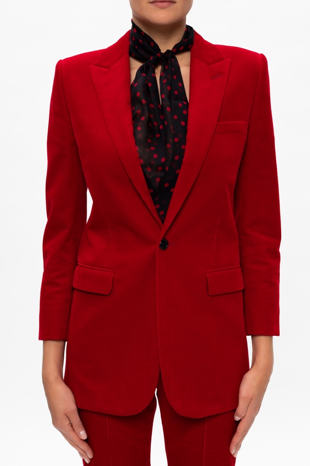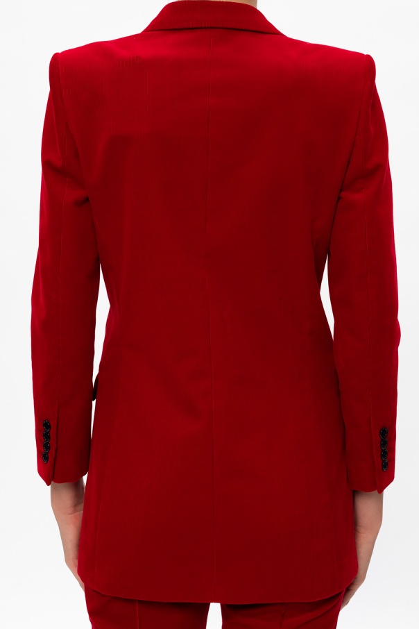 Red ribbed blazer with peak lapels from Saint Laurent. Crafted from cotton, this garment features a button fastening, two flap pockets and one chest pocket.