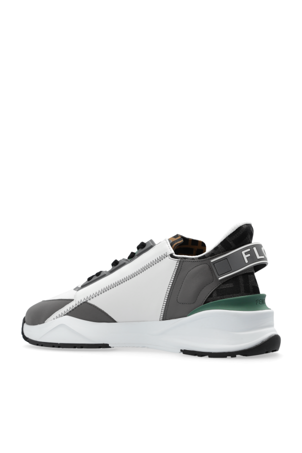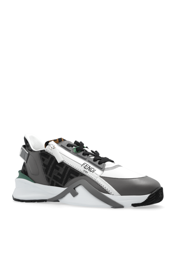 White, grey and green ‘Flow’ sneakers from Fendi. Made of leather, coated monogram canvas and rubber, this lace-up pair features a side zip, printed and embossed logo, rubber pull tab at the heel and a rubber sole with an F detail in grey, white and black.