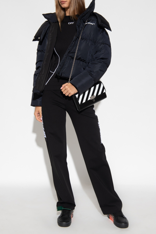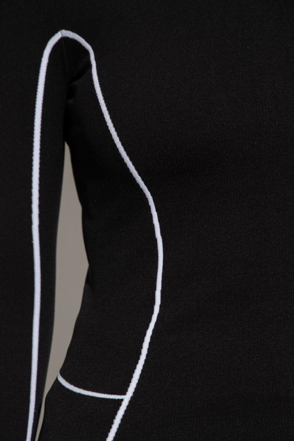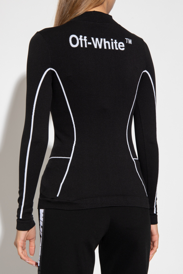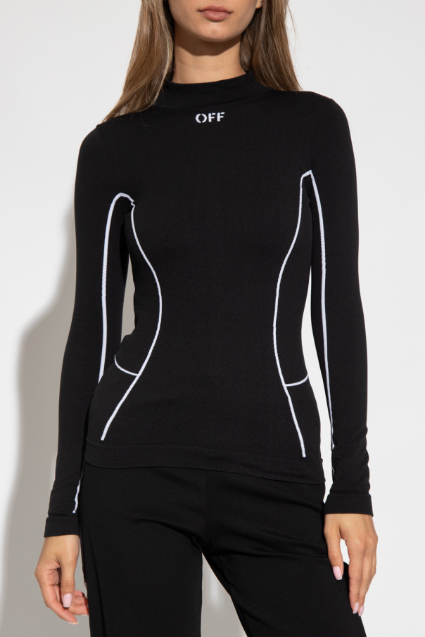 Black and white fitted top with a stand collar from Off-White, the ‘Active’ line. Crafted from recycled elastic fabric, this long sleeve design is decorated with a white logo.