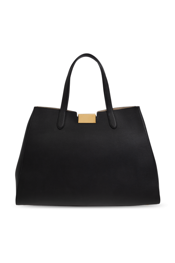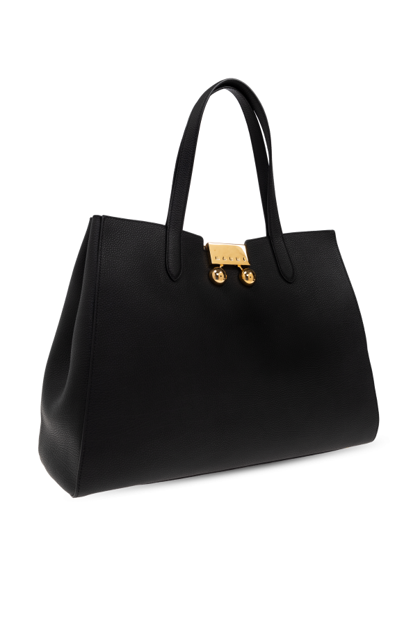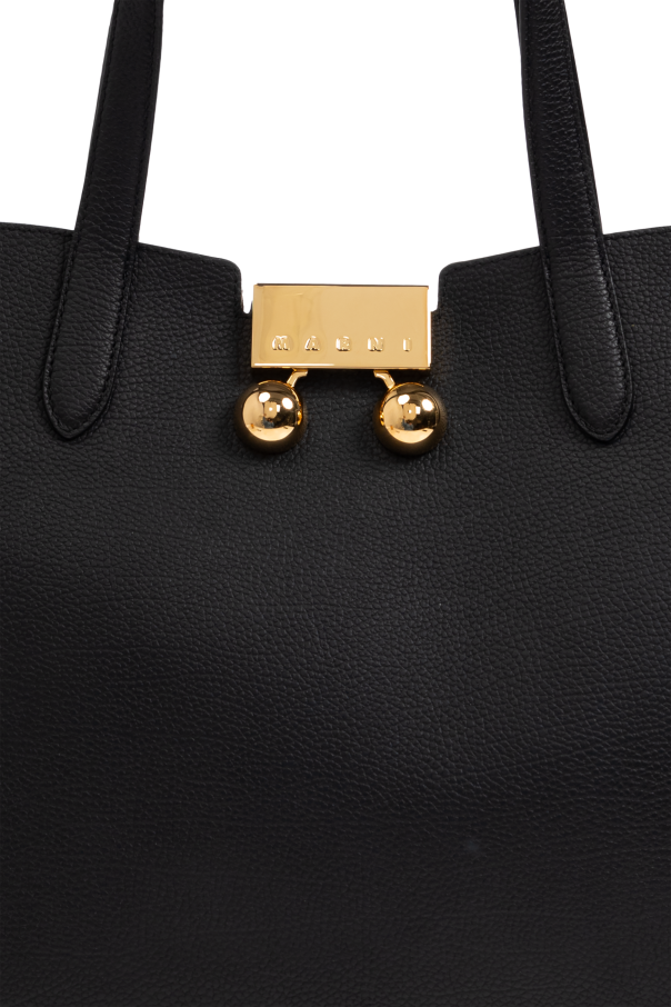 Introducing the \'Trunkaroo Medium\' shopper bag, an epitome of sophistication from Marni\'s exclusive collection. Crafted from high-quality calf leather with a distinctive texture, this bag embodies both elegance and practicality. The classic rectangular shape with rounded edges and a dominant black hue speaks of timeless style. Adorned with golden metal accents, including a unique two-ball closure and a gold-plated brand logo, the bag exudes a refined allure. The two sturdy leather handles ensure effortless carrying, while the interior, lined with light-colored fabric, features a secure zippered compartment and an additional pocket, providing ample space for your essentials. Designed by the renowned Marni, under the creative direction of Francisco Russo, the bag reflects the brand\'s commitment to eclectic and bold designs, accentuating its global appeal. Why Choose This Product? High-quality calf leather construction Elegant golden metal detailing Spacious interior with secure compartments Designed by Marni, known for eclectic and bold styles