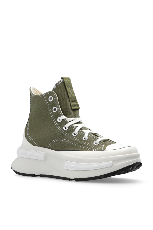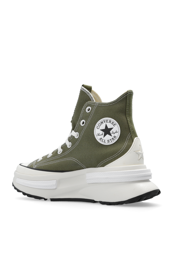 Green and cream ‘Run Star Legacy CX High‘ lace-up sneakers from Converse. Made of cotton canvas, this design features a stripe on the tongue, the brand‘s signature logo patch in white and black, the iconic star motif embossed at the back and a chunky sole made of rubber in black, cream and white.
