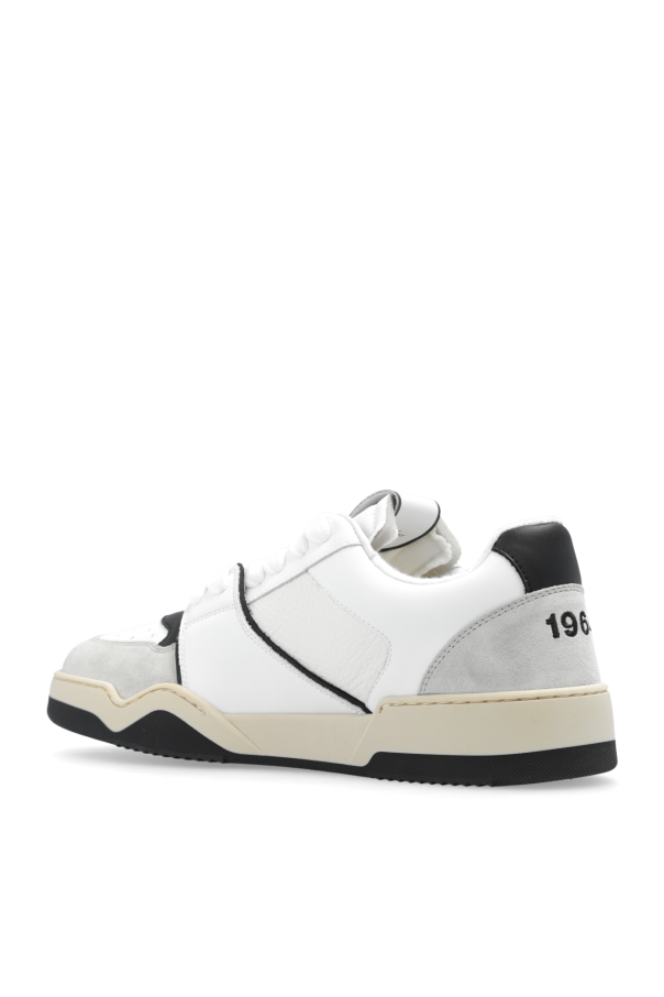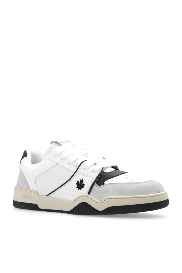 White, black and light grey ‘Spiker’ sneakers from Dsquared2. Made of leather and fabric, this lace-up pair features a patch, logo embroidery, perforations, raw-trimmed tongue and rubber sole in black and beige.