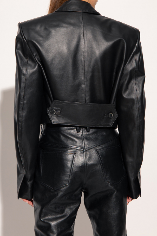 Black ‘Reiff’ blazer from The Mannei. Crafted from leather with a cropped silhouette, this style features a double button fastening, peak lapels, a slip pocket o the front, padded shoulders and a back belt with buttons.