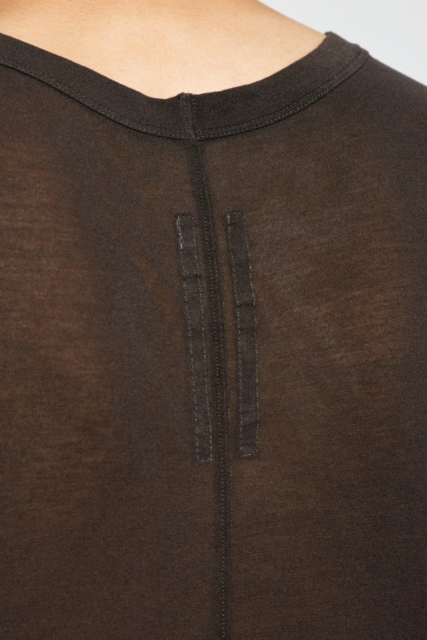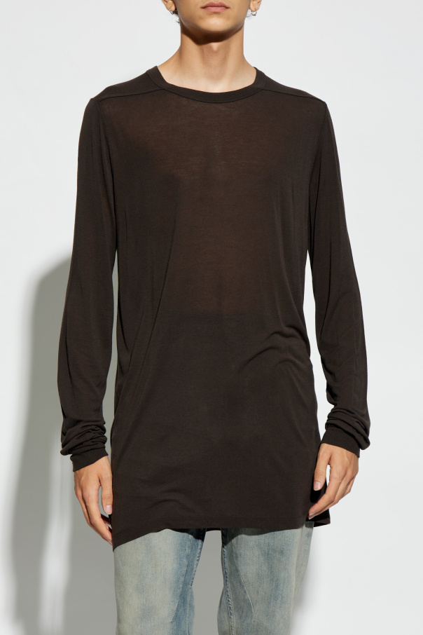 Introducing the T-shirt \'Level\' from the exclusive collection by renowned designer Rick Owens. This men\'s long-sleeve t-shirt exemplifies understated elegance, combining a classic crew neck and a minimalist design to create a sophisticated wardrobe staple. Crafted from a luxurious blend of viscose and silk, this t-shirt offers unparalleled softness and comfort. The rich brown hue provides a versatile option for various styles, from casual to refined. The t-shirt features: A simple, classic cut with long sleeves and fitted cuffs. Durable yet soft material, ensuring comfort throughout the day. A minimalist design devoid of logos or patterns, emphasizing its elegant simplicity. In a stylish ensemble, this t-shirt is paired with a black jacket, light jeans, and black shoes, showcasing its versatility and casual elegance. Why Choose This Product? Designed by the acclaimed Rick Owens, known for his bold and unforgettable fashion. Made from a high-quality blend of viscose and silk for superior comfort and durability. Timeless brown color that easily complements various outfits. Minimalist aesthetic that highlights refined taste and sophistication.