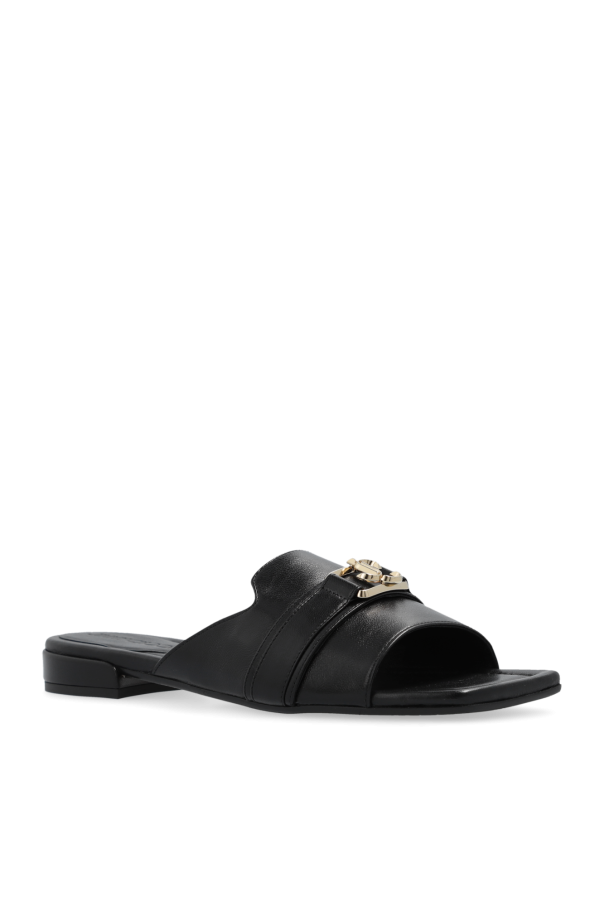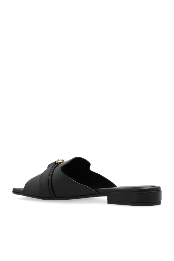 Black ‘Nako’ slides from Jimmy Choo. Made from leather with a square toe, this model sits on a beige and black sole in leather and rubber sole and features an asymmetrical front accentuated with a strap and gold-tone logo buckle.